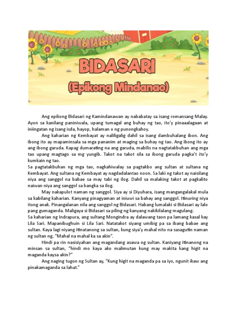 Bidasari tauhan at katangian. Batay sa nabasang epiko Bihag ni Lam-ang magbigay ng limang katangian ng isang epiko. Sultan Mongindra- siya ang Sultan ng Indrapura at naging asawa ni Bidasari. Si Tuwaang na pangunahing tauhan sa Ang Tuwaang na kilalang epiko ng mga Bagobo o ang mga tao na naninirahan sa dulong bahagi ng Cotabato Bukidnon at Davao ay isang uri ng puno na kung tawagin nila ay kuaman.