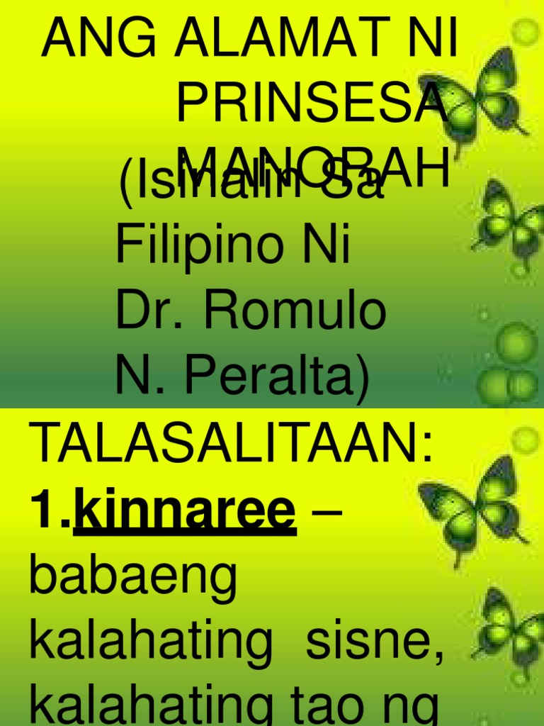 Republika ng Pilipinas KAGAWARAN NG EDUKASYON Filipino Grade 9 Unang Markahan. Peralta Isang alamat na pasalin-salin sa ibat ibang panahon at henerasyon mula noong panahon ng Ayutthaya at nagbigay-inspirasyon kay Haring Rama V ng Thailand. Sa madaling salita sa mga manunulat ikinukwento nila ang mga elemento ng istorya ng Prinsesa Manorah sa pamamagitan ng pag detalye sa bawat pangyayari.