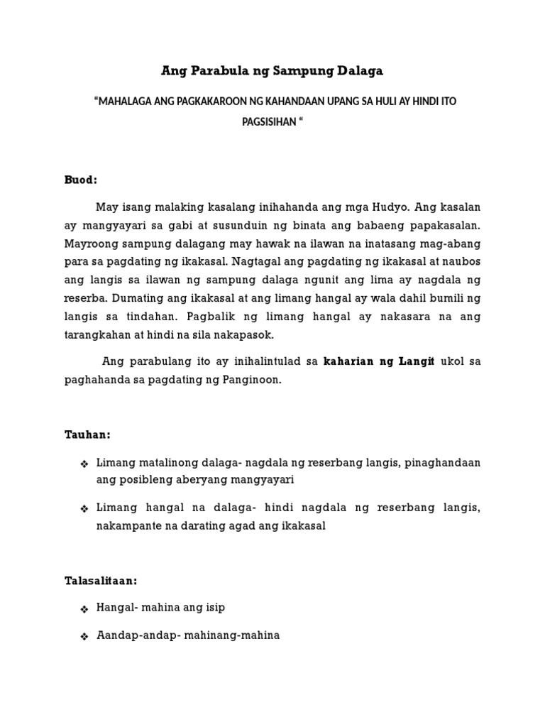 Tap again to see term. Ang Parabula ng Sampung Dalaga. Dito isinagawa ang seremonya ng kasal na magaganap Nakaganyak ng mga mambabasa ang panimula sapagkat may tanong na nakalahad o nailahad upang mas maimbita ang tao na basahin ang suliranin ang parabula.