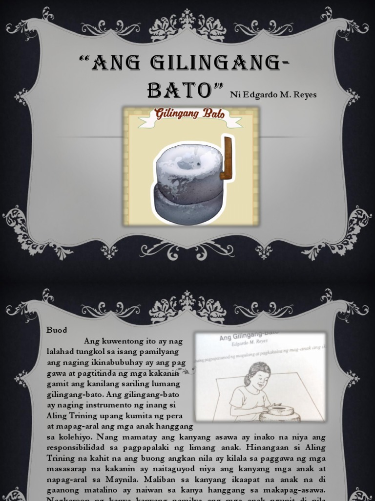 Ano ang Maikling Kwento. Ang kuwento ito ay naglalahad tungkol sa isang pamilyang ang naging ikinabuhay ay ang paggawa at pagtitinda ng mga kakanin gamit ang kanilang sariling lumang gilingang-bato. Sa likod niyan ay wala nang makapaglalahad sa kasaysayan ng gilingang bato maliban sa sabi-sabi na ang kalahian daw ni Ina ay kalahian ng magpuputo Halaw mula sa Gilingang Bato ni Edgardo Reyes Juan lamang ang nalaman niyang pangalan ng.