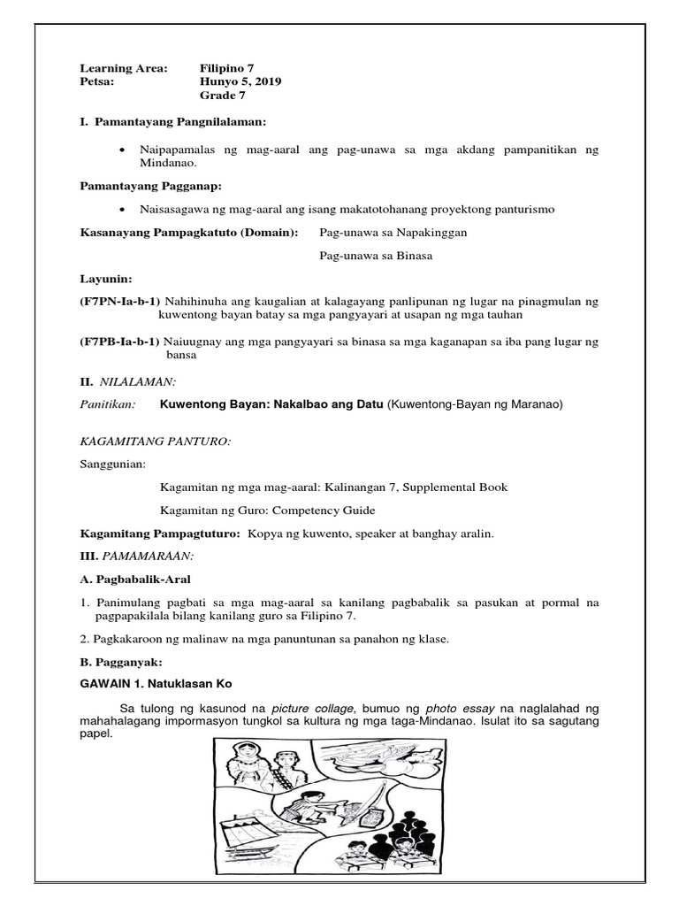 Sa kwentong ito ay may anim na tauhan. Ang Pilosopo Kuwentong Maranao Ang Pilosopo Noong unang panahon may isang bayan na ang naninirahan ay mga taong sunudsunuran na lamang dahil sa takot na masuway ang batas na umiiral sa nasabing bayan. F7PN-Ia-b-1 Nahihinuha ang kaugalian at kalagayang panlipunan ng lugar na pinagmulan ng kuwentong bayan bataysa mga pangyayari at usapan ng mga tauhan Oral RecitationPaglalarawan sa mga kaugalian at tradisyon ng mga Maranao batay sa mga usapan ng tauhan at pangyayari sa nabasang kuwentong bayanGamiting gabay ang sumusunod na.