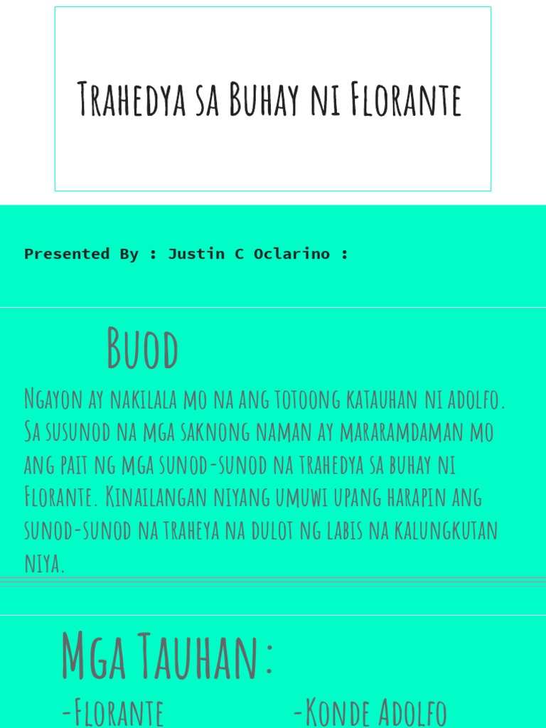 Ang kanyang inggit at paninibugho sa binata ang naging sanhi ng pananakop niya sa Albanya pagpatay sa hari at mga tauhan pagpapahirap kay Florante at tangkang pag-agaw kay Laura. Share or Tweet to Unlock the PDF imagesvgxml Download the PDF version of this post and read it offline on any device at any time. Florante at Laura Buod ng bawat kabanata mlf.