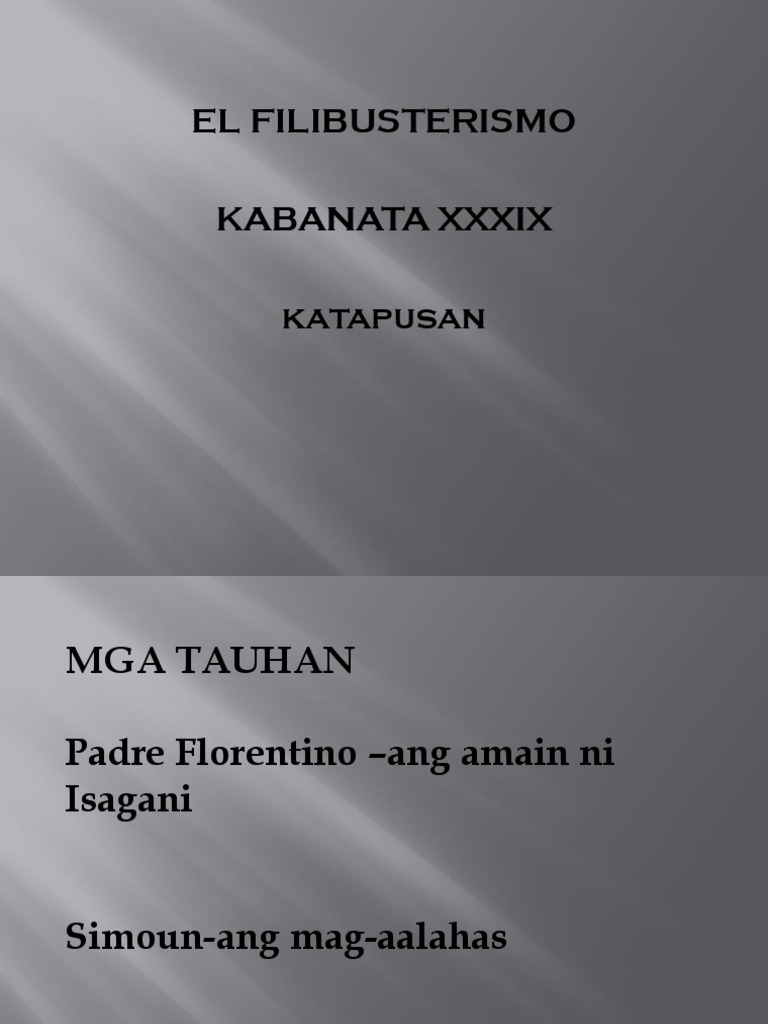 Mga Tauhan sa El Filibusterismo ni Jose RizalSimounAng mapagpanggap na mag-aalahas na nakasalaming may kulayIsaganiAng makatang kasintahan ni PaulitaBasilioAng mag-aaral ng medisina at kasintahan ni JuliKabesang TalesAng naghahangad ng karapatan sa pagmamay- ari ng lupang sinasaka na inaangkin ng mga prayleTandang SeloAma ni Kabesang. Ito ay nasa sulat-kamay ni Rizal at binubuo ng. Isasalaysay ng kapitan ng bapor ang alamat ni Donya Geronima ang alamat ng Intsik na hindi binyagan at ang kuwento ng mag-amang Ibarra.
